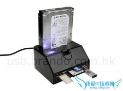 其实这更像是我们之前已经见过的那款eSATA外置硬盘架集合了读卡器的功能。不过,与之前的那款产品不同,虽然同样可以支持2.5寸和3.5寸两种规格的硬盘,但只有一个插...