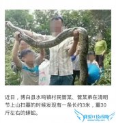 据玉林热门微博爆料,玉林博白水鸣镇村民管某两兄弟近日扫墓时发现一条长约3米,重30斤的大蟒蛇。结果二人见这条蟒蛇体型巨大肥硕便捉回家一锅给炖了,而且还将照片...