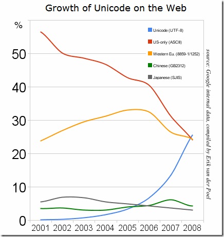 由此图可以看出,2001-2008年期间,GB2312编码的使用情况虽然幅度不大,但还是在稳定上升的;蓝色的线表示出用UTF-8的网站越来越多了。