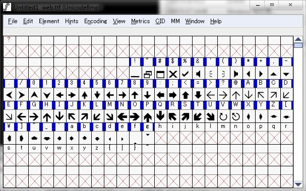 接下来我们要做的就是选择需要的字符,存到另一个字体文件里,因为WEBDINGS.TTF这个文件里的大多数字符都是用不到的,所以直接用这个文件来当我们的字符库有点略大,所以我们只需选择我们需要的就行,操作上我们先新建一个空白的字体文件,点File->New,然后选择需要的字符,并复制到新建的字体文件中,如: