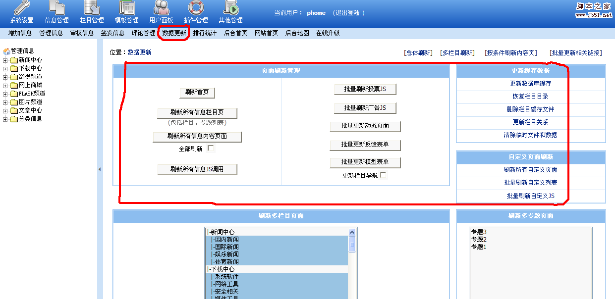 安装好后的第一步是更新系统,点击后台顶部的“数据更新”就进入了数据更新的页面,如下图: