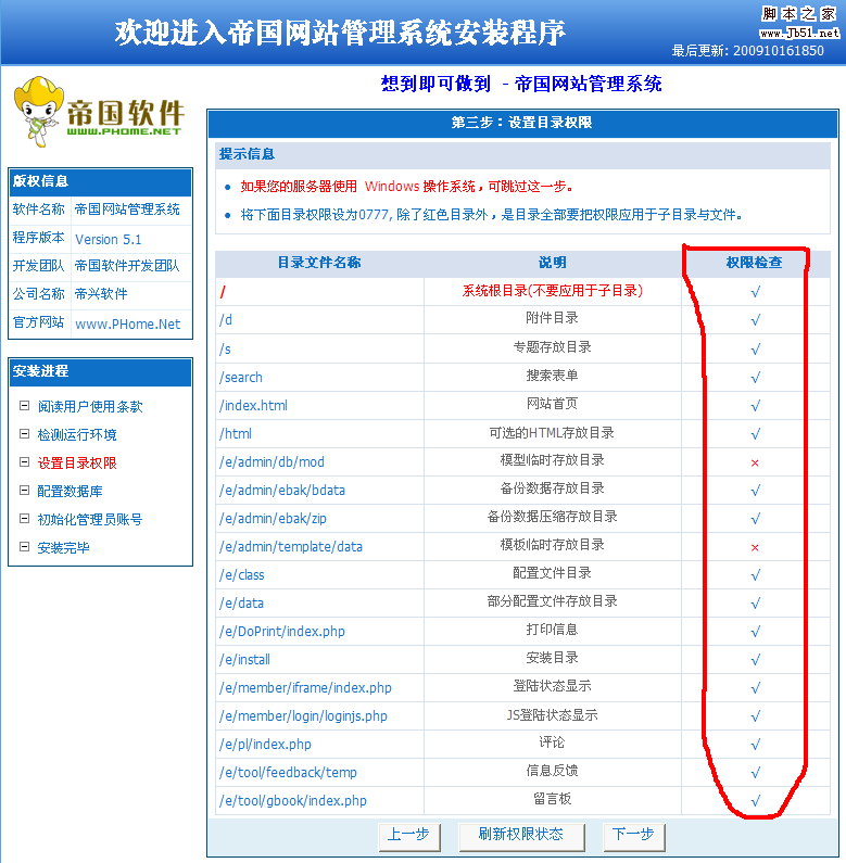 如果测试结果显示全部都支持,就直接点下一步。然后就进入了“设置目录权限”的页面。这一步是检测文件和目录是否有足够的读写权限,如果没有足够的读写权限,有可能会安装不成功,或者安装成功后使用的过程中会出现问题。如下图所示:
