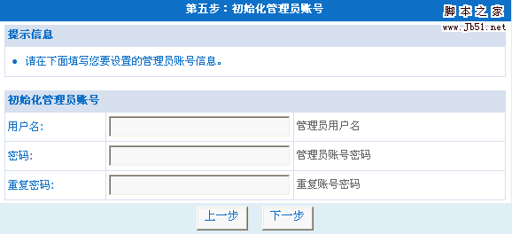 如果数据库信息都填写这确,这个时候系统就会自动安装系统,否则会弹出出错的提示。安装完毕后,进入第五步,初始化管理员账号。也就是设置你的网站的后台管理员帐号。如图: