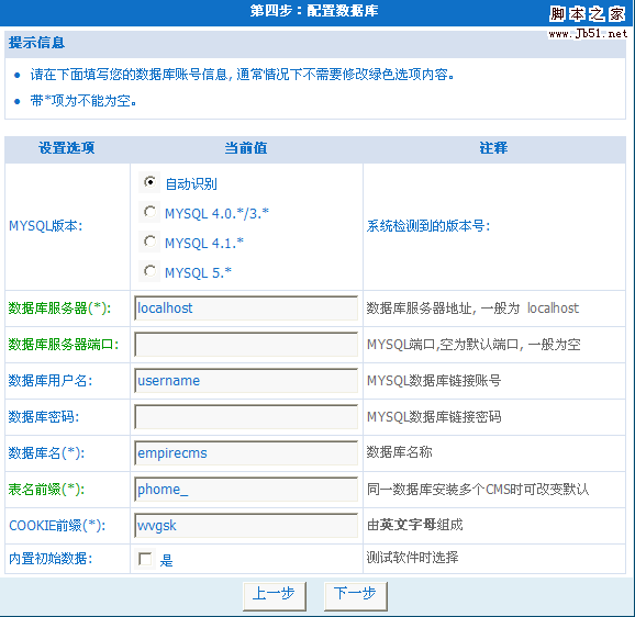 这个时候,就进入了第四步,配置数据库。前面已经说过了,帝国CMS需要空间支持是PHP+MYSQL数据库。这里的配置数据库就是MYSQL数据库。如下图所示: