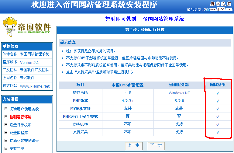 这里毫无疑问,直接点“我同意”,否则不给你用。哈哈哈哈。点击同意后,会进入一个“检测运行环境”的页面。这一步会自动检测到你的虚拟主机是否支持帝国CMS的程序,要想安装成功,在“测试结果”那一栏必须全部显示“√”。如下图: