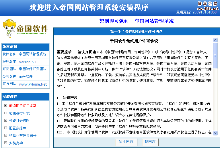 将上图中的所有文件上传完毕后,在浏览器的地址栏中输入帝国CMS的安装地址“http://你的域名/e/”。我是在本地测试的,所以我的域名是localhost,我只需在IE地址栏里输入http://localhost/e/install/。回车后就进入了安装页面,如下图所示: