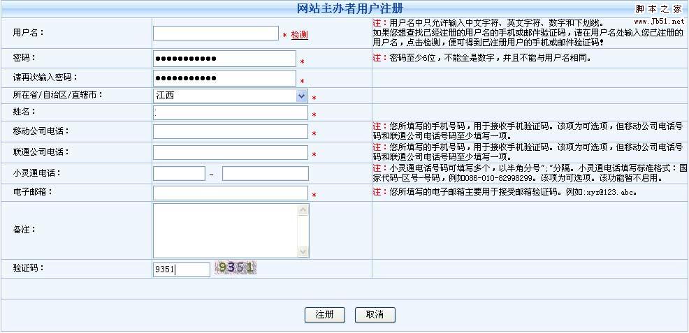 第二步:填写注册信息,这里的用户名和密码是用来登陆填备案网站的信息的,所以必须记住,姓名、手机、电子邮箱需要填真实的,因为手机和邮箱需要接受一个验证码,第一次登陆时会提示你输入验证码,如果不知道怎么填看右侧的注释;填写完毕后点“注册”。