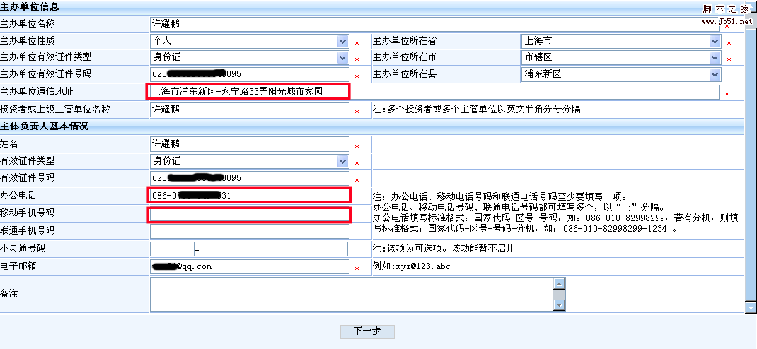 第五步:首先需要填写的是“填写ICP备案主体信息”,这里需要注意的是:1)、主办单位通信地址必须是真实且存在的,而且必须详细到门牌号,由于我这里是做演示所以没认真填,2)、办公电话和手机号必须填写和地址相符合的号码,比如你填的上海的地址电话号码就要填上海的号;填写完毕以后点“下一步”‘