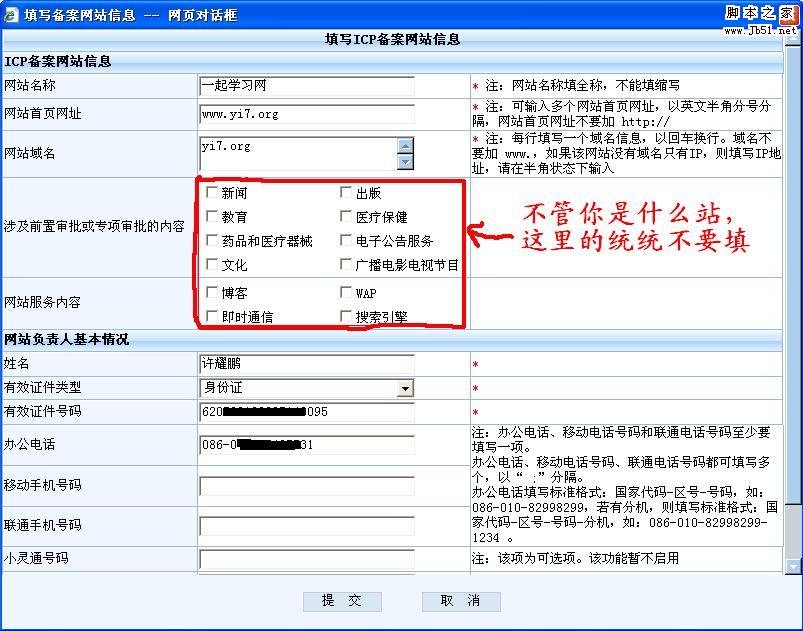 第七步:在弹出来的小窗口如下图所示,下图中姓名、身份证号、电话、手机必须和你前面填的一样;红框里的内容不用填,如果你填了,有可能会无法通过审核或速度很慢;填完后点“提交”会返回;