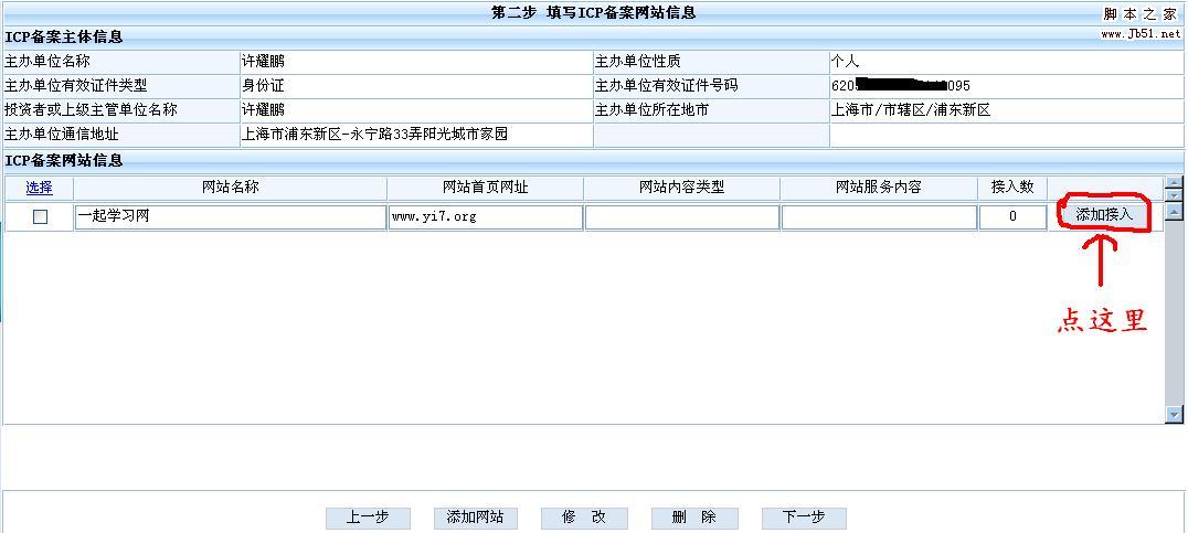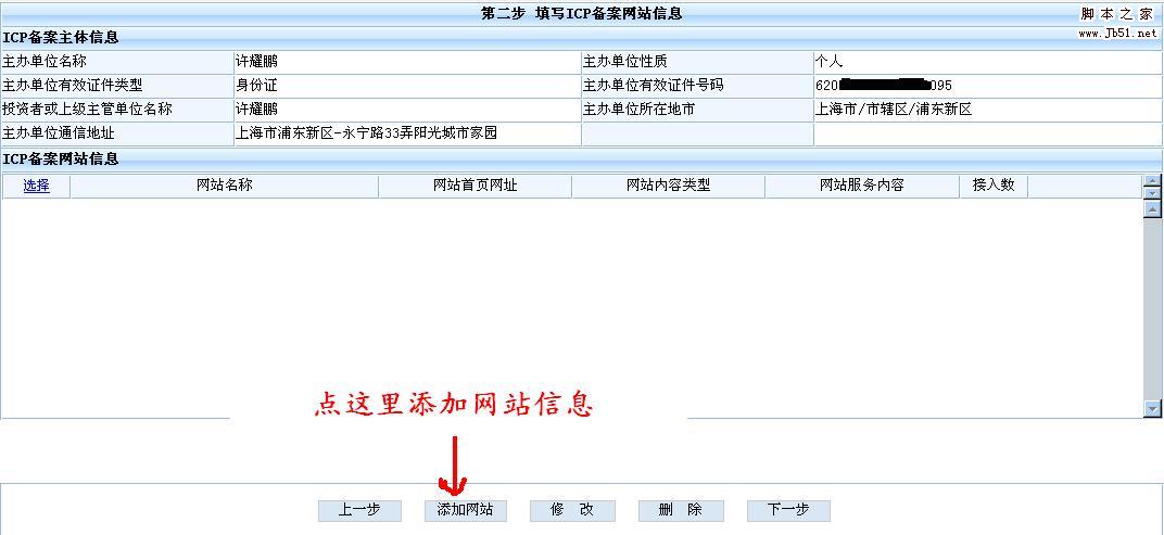 第六步:填写“ICP备案网站信息”,这里直接点“添加网站”,如图所示,点了以后会出来一个小窗口;