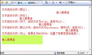 文字滚动示例(默认方向,滚动方式为alternate,循环3次,速度为2):<marquee scrollamount="2" behavior="alternate" loop="3">做人要厚道</marquee>