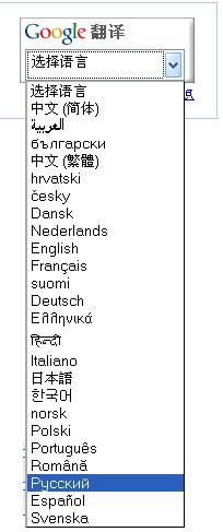 当你把上列的 html 代码粘贴入你的网页代码后,谷歌翻译小工具的菜单选择控制就会如图一加入在你的网页相对位置中。菜单会提示使用者“选择语言”,而这段“选择语言”的文字也会以使用者的流览器介面语言显示出。例如,如果使用者所用的是英文的浏览器,那这段提示文字就是“Select Language”;如果使用者所用的是俄文的浏览器,那这段提示文字就是“Выберите язык” 。这样,外文使用者通过谷歌翻译小工具可以用自己熟悉的语言浏览了。当使用者按下菜单后,谷歌翻译小工具会显示二十种语言在菜单中。