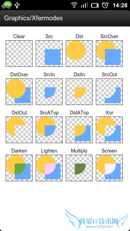 PorterDuffXfermode 这是一个非常强大的转换模式,使用它,可以使用图像合成的16条Porter-Duff规则的任意一条来控制Paint如何与已有的Canvas图像进行交互。