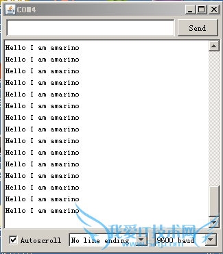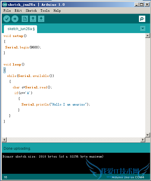 void setup() { Serial.begin(9600); } void loop() { while(Serial.available()) { char c=Serial.read(); if(c=='A') { Serial.println("Hello I am amarino"); } } }