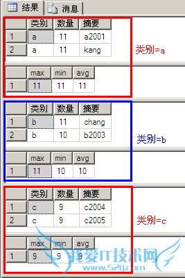 示例11与示例10相比多了“order by 类别”和“... by 类别”,示例10的执行结果实际是按照分组(a、b、c)进行了显示,每组都是由改组数据列表和改组数统计结果组成,另外: