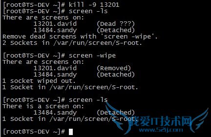 如果由于某种原因其中一个会话死掉了(例如人为杀掉该会话),这时screen -list会显示该会话为dead状态。使用screen -wipe命令清除该会话: