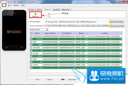 2、选择txt文件以后软件会出现很多分区准备信息,我们继续点击【Download】,软件会等待手机连接;此时我们手机在关机状态下通过数据线连接手机(如果是台式机最好将数据线连接在主机箱后面的USB接口),软件识别手机后会自动进行刷机升级。