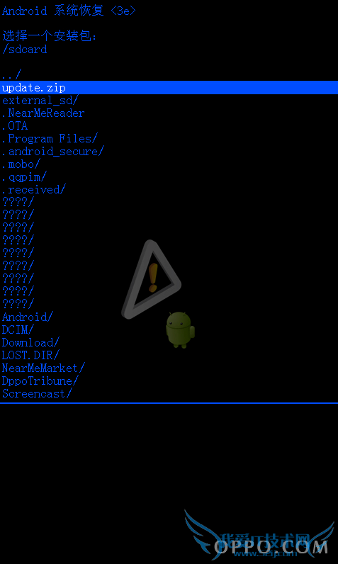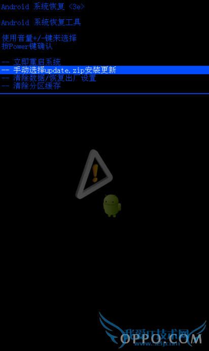 4.用音量加减键控制选项,选中“手动选择update.zip安装更新”,然后按电源键进入。