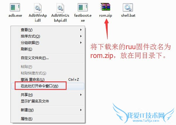 2.解压我们下载的fastboot工具箱,讲下载下来的*.zip格式刷机包改名为【rom.zip】放在同目录下,在文件夹下打开命令窗口(按住Shift鼠标右击空白处)。如图: