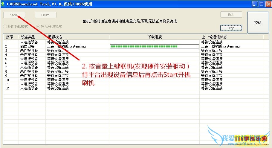 2.打开工具里面的刷机平台13095DownloadTool,不用选择直接点击Start,把手机强制关机,然后按音量上连接数据线,出现新硬件的时候再安装驱动,如图