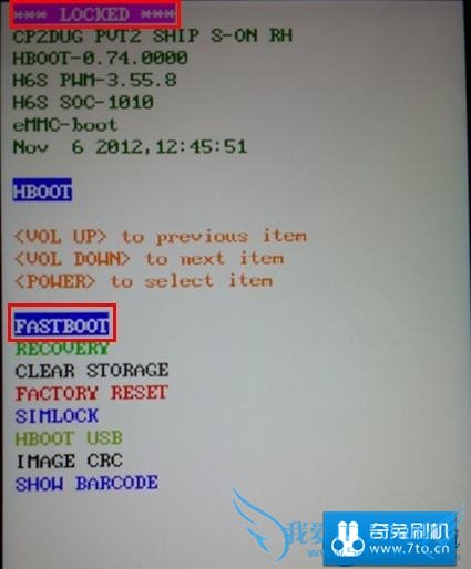 1.手动关机并取出电池5秒后再自行装入,接着长按音量下+电源键进入Hboot模式;此时蓝色框默认选择Fastboot,按一下电源键确认进入Fastboot模式同时需确认为LOCKED状态