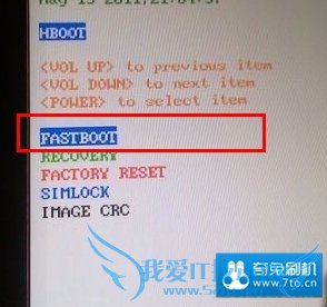 1:把手机关机,然后在关机状态下按住手机的 音量下键 和 电源键 进入HBOOT模式,然后按音量键选择FASTBOOT,然后按电源键确认,进入FASTBOOT界面