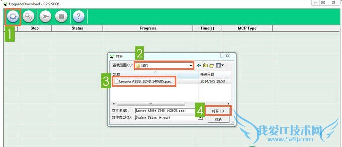2)点击下图 1处 选择 固件 文件夹下的 Lenovo A388t_S248_140605.pac 文件,之后刷机工具会加载升级包,约过几秒以后,刷机包加载完成,并且会在显示相对应的升级包的名称