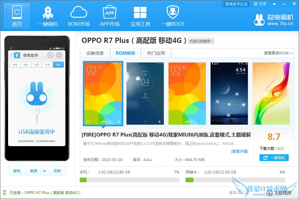 玩安卓手机最大的乐趣当然就是刷机了,为了让OPPO R7 Plus(高配版 移动4G)手机变的更快,通常都会通过刷机来提高OPPO R7 Plus(高配版 移动4G)手机的运行速度,下面跟大家分享怎么用奇兔刷机对OPPO R7 Plus(高配版 移动4G)进行一键刷机,具体步骤如下: