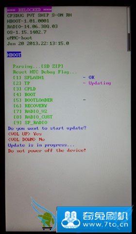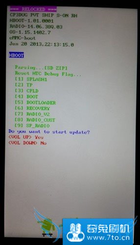 2、手机在关机状态下,同时按下音量下键+开关机键,手机自动进入 Hboot 模式将自动升级,点音量上键确认