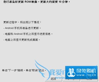 9:将显示一条确认信息,表明在 Android 手机上安装必要文件 (包括无线电通讯模块映像) 所需时间。单击下一步开始更新。更新过程中,屏幕上会显示不停变化的进度条。