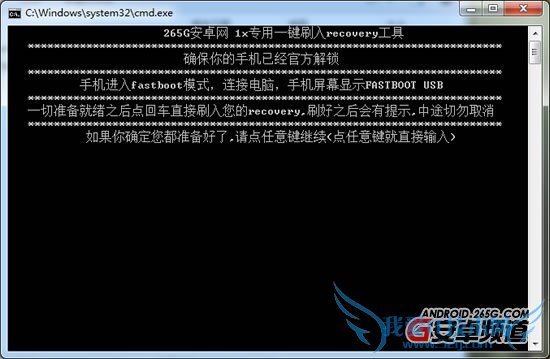 4.打开已经下载好的HTC G23/One X Recovery一键刷入软件,点击Recovery.bat,根据提示,点击任意键则程序会自动将Recovery输入到你的One X中。