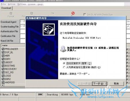 1.首先安装安卓驱动,再关机,数据线连接电脑和手机,打开电脑的设备管理器(端口com和lpt),拔掉电池,安装电池,电脑右下角就会出现一个硬件识别,发现新硬件(MTK65** preloader),弹出对话框