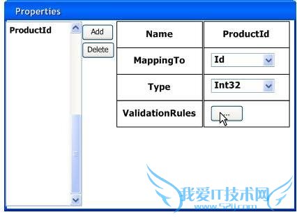 4.MappingTypeName:这个配置项就表明这个业务类会和哪个数据来源体的属性进行映射,如,在上面选择了MappingType为DataEntity,而且选择DataEntity的名字MS_Product(通过Linq生成的实体,对应数据库中的MS_Product表)。当然,一个业务类的属性字段可能来自多个DataEntity的组合,所以,这里的MappingTypeName是多个。