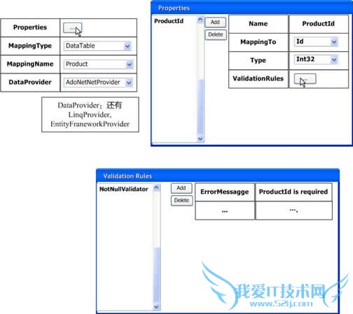 当我们新添加了一个业务类的以后,假设这个业务类的为 Product,在”解决方案”管理器中点击右键,选择”配置业务类”,就会弹出图形化的配置窗体,从草图中可以看出: