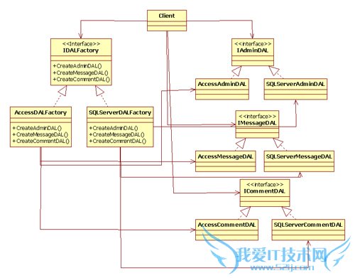 数据库的数据访问层,它们都实现了数据访问层接口。每个数据访问层有自己的工厂,所有工厂都实现自IDALFactory接口。而客户类(这里就是业务逻辑层类)仅与工厂接口、数据访问层接口耦合,而与具体类无关,这样,只要通过配置文件确定实例化哪个工厂,就可以得到不同的数据访问层。