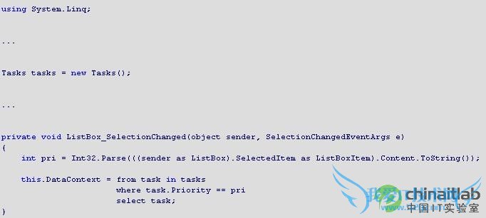 在第一个列表框中选择一项会激发下面的事件处理程序。在本示例中,Tasks 是 Task 对象的集合。Task 类具有名为 Priority 的属性。此事件处理程序运行一个 LINQ 查询,该查询返回具有选定优先级值的 Task 对象的集合,然后将其设置为 DataContext: