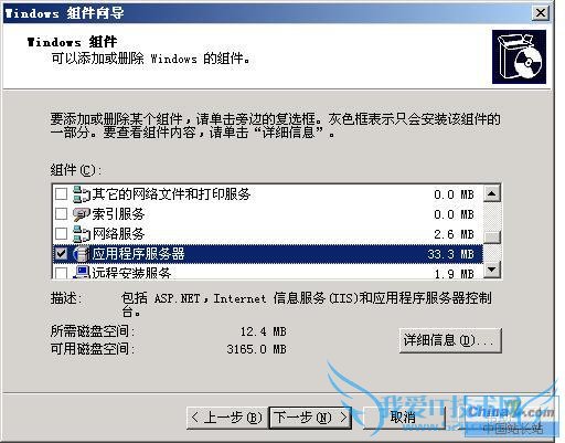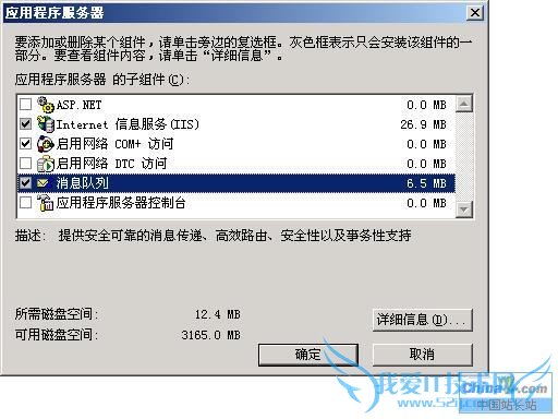用程序服务器,双击它进入详细资料中选择消息队列一项进行安装,如图: