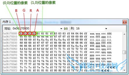 在BitmapData中有一个重要的属性Scan0,它是一个指针,指向了图片数据所在内存的第一个位置。使用内存跟踪,将Scan0的值填入地址中,可以看到内存的分配情况(Format32bppArgb颜色深度):