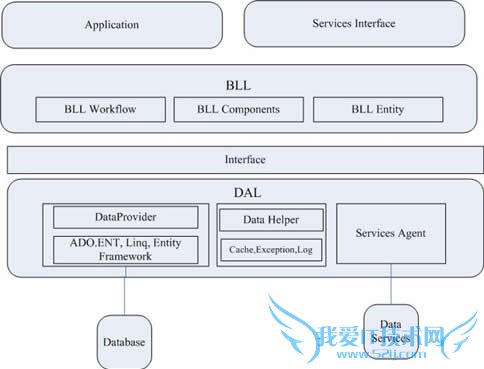 之前第一张图中,在DAL上定义一个接口,用来接耦,但是在第二张图有做了一些修改--把DAL做为服务提供出去。之所以做了这个修改,因为在开始思考的时候,只是认为底层设计的DAL只是给BLL使用。可以发觉到一点:在DAL中,数据可以从远程的服务中获取,那么可能我们这里的DAL也可以作为服务给其他的人设计的DAL使用,也就是说,我们的这里的DAL成了远程服务的数据源。所以做了上面的修改。但是这个思考到还会改进,因为这里面问题(读者朋友可以先自己思考是什么问题)。