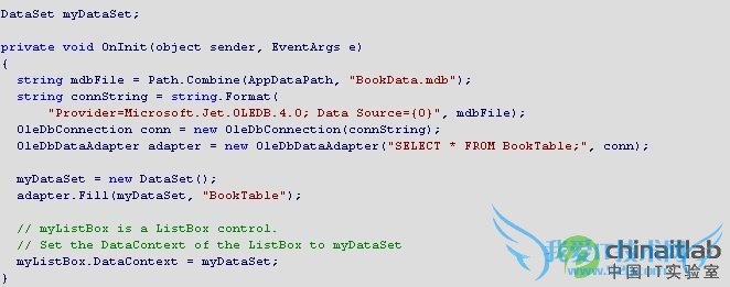 在本示例中,OleDbConnection 对象用于连接到数据源,该数据源是在连接字符串中指定的 Access MDB 文件。建立连接后,会创建一个 OleDbDataAdpater 对象。OleDbDataAdpater 对象执行一个 select 结构化查询语言 (SQL) 语句,以便从数据库中检索记录集。通过调用 OleDbDataAdapter 的 Fill 方法,此 SQL 命令的结果存储在 DataSet 的 DataTable 中。本示例中,DataTable 命名为 BookTable。然后,此示例将 ListBox 的 DataContext 属性设置为 DataSet 对象。