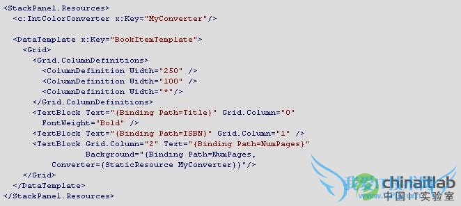 IntColorConverter 将 int 转换为颜色。利用此转换器,如果 NumPages 的值小于 350,则第三个 TextBlock 的 Background 颜色为绿色,否则为红色。此处未显示此转换器的实现。