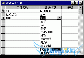 (3)按“Tab”键,光标移到“数据类型”栏,此时单元格变为一个下拉列表框,单击列表框旁的下位箭头,里面显示了全部可选字段类型。选择“超级链接”字段类型;