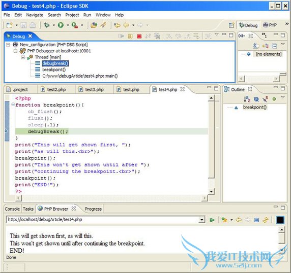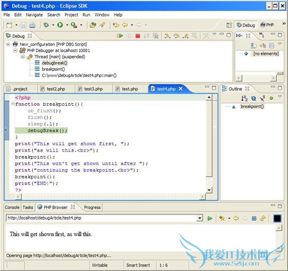 在像清单 4 那样编写完代码之后,可以打开浏览器并指向 test4.php,或者可以查看 PHP 浏览器窗口(我的是 http://localhost/debugArticle/test4.php)。每次输入和保存文件时,在 PHP 浏览器窗口中就已经启动了调试序列。如果不使用 Windows,请通过浏览器查看 test4.php。在保存了文件之后,用 F8 或单击 Run > Resume 继续代码执行。持续这么做,直到最后一行输出是 END! 为止(参见图 9、10 和 11)。