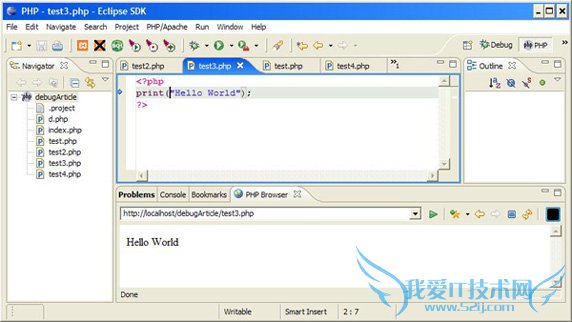从上面定义的 test3.php 中删除逗号(,)。按 Ctrl+S 保存文件,然后观察 PHP 浏览器窗口的更新,显示了 Hello World(参见图 7)。