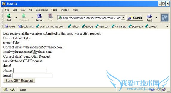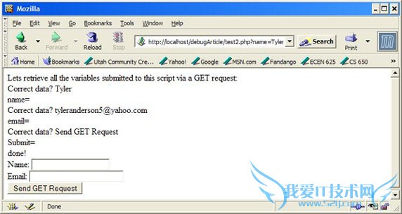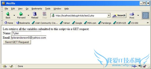 现在单击 Send GET Request 按钮,请注意只有 $_GET 请求的键显示在浏览器上,而正确的值都没显示。可以在循环中放一个 print 语句,检验在 foreach 循环中每个元素中是否确实存在数据。请参阅清单 3。
