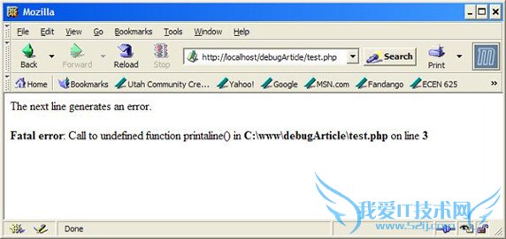 也可以用出错消息为自己服务,因为它们会显示抛出或生成错误的正确代码行。这样,调试就变成在浏览器上查看生成的错误所显示的行号,并在代码中检查这一行。稍后,将会看到 PHPEclipse 插件通过即时地给语法错误加下划线并在保存文件时用红色 “x” 标注语法错误,可在开发和调试过程中提供极大的帮助。