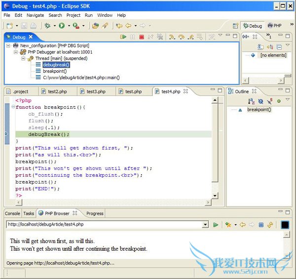 breakpoint() 函数会把缓冲的输出和其他缓冲的数据刷新到 Web 浏览器。对 sleep(.1) 的调用是必需的,这样代码中止于 debugBreak() 之前,服务器才有足够的时间把数据刷新到 Web 浏览器,这个函数是前面下载的 PHP 调试器扩展的内部函数。这样,调用 breakpoint() 会把 HTML 块、print() 和 echo() 语句的数据刷新到浏览器,然后中止代码执行。