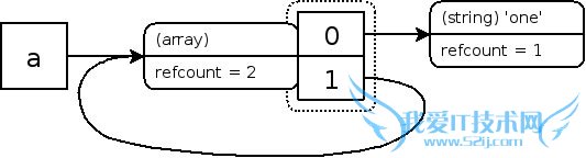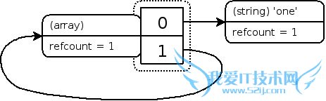 尽管现在已经没有一个任意作用域的符号指向这个结构,但是它的内存还是不能释放,因为数组元素”1” 一直指向同一数组, 因为已经没有任何外部符号指向它,所以用户没有任何方法来清除这个结构(memoryleak!!)这样你将得到一个内存泄露。 幸运的是,在页面请求结束时,PHP将会清除这个数据结构。但是之前,它讲一直在内存中占用空间,这种情况会在你实现了一个分析算法或者其他的子元素包含“父级“元素的时候常常发生,当然同样的情况也会在对象上发生那个,实际上大部分会在对象上发生。因为一个对象尝尝隐含的通过引用来使用。