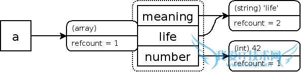 这三个zval 容器分别为 “a”,”meaning” 和”number”,简单的规则同样适用于它们对”refcount” 的增减: