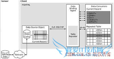 数据绑定体系结构包括四个组成部分:数据源对象(Data Source Object)、数据显示对象(Data Consumers)和两个代理器(Binding Agent与Table Reptition Agent)。数据源对象向网页提供数据,数据显示对象就是显示数据的HTML元素,代理器则用来保证前两者的工作同步。图1显示了这四个部分协同工作的原理。
